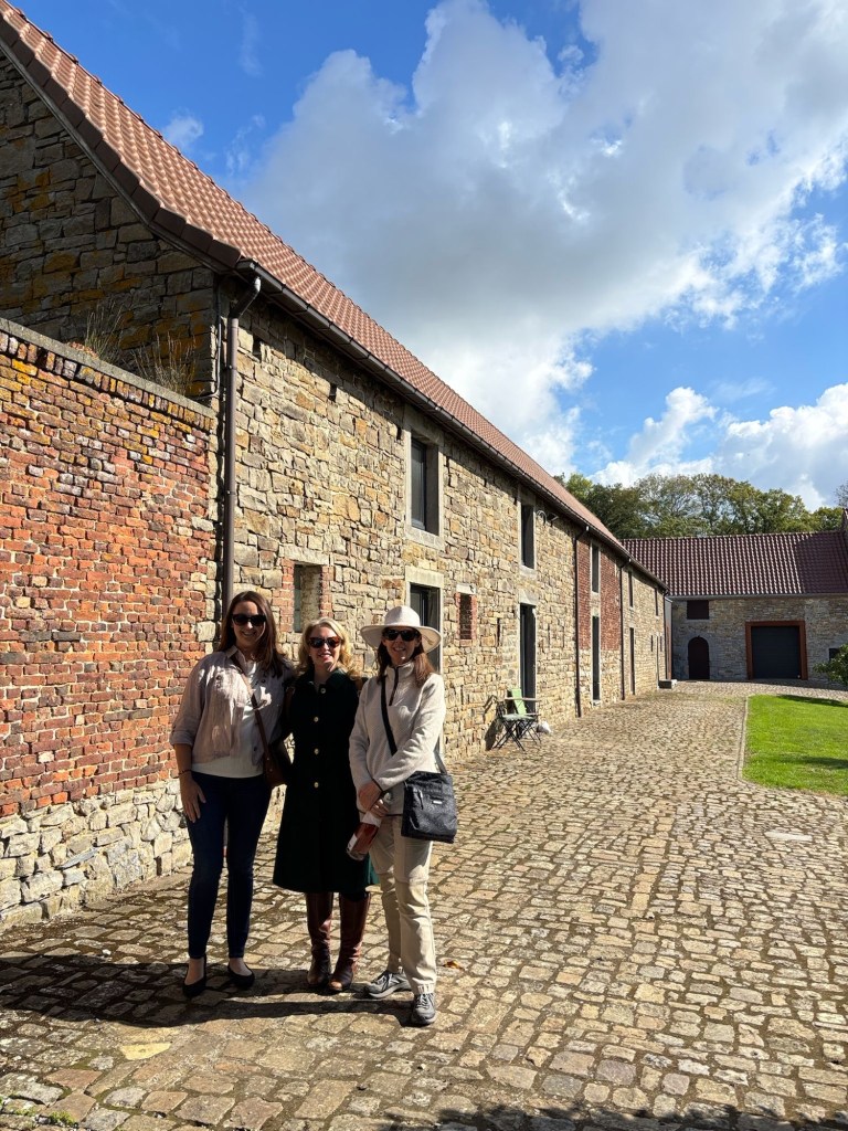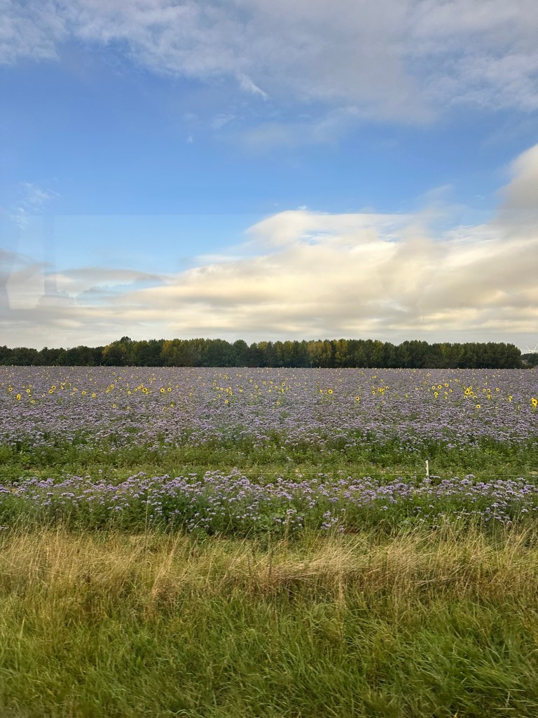 NIC is an all volunteer club. Each person bringing a skill set to the group. There are tours, walks/hikes, coffees, lunches, monthly meetings, creative groups, book clubs, and more. Today I joined the vineyard excursion with 30 ladies on a tour bus for an hour long ride in the Belgium countryside. A lovely trip with beautiful views and fun banter. At one point our host yells out “look right” for us to see a beautiful field of purple flowers with sunflowers growing throughout. We all ooohed and aaahed. Such beauty.