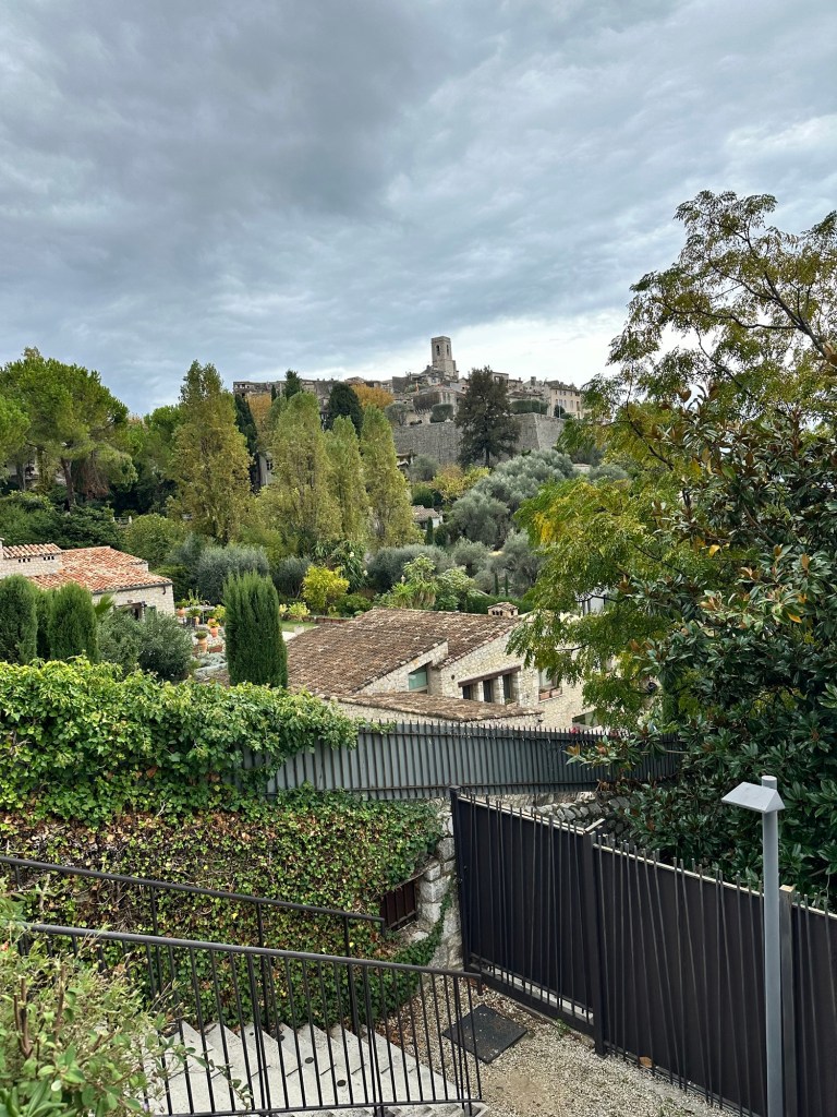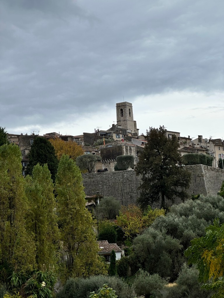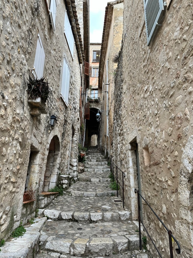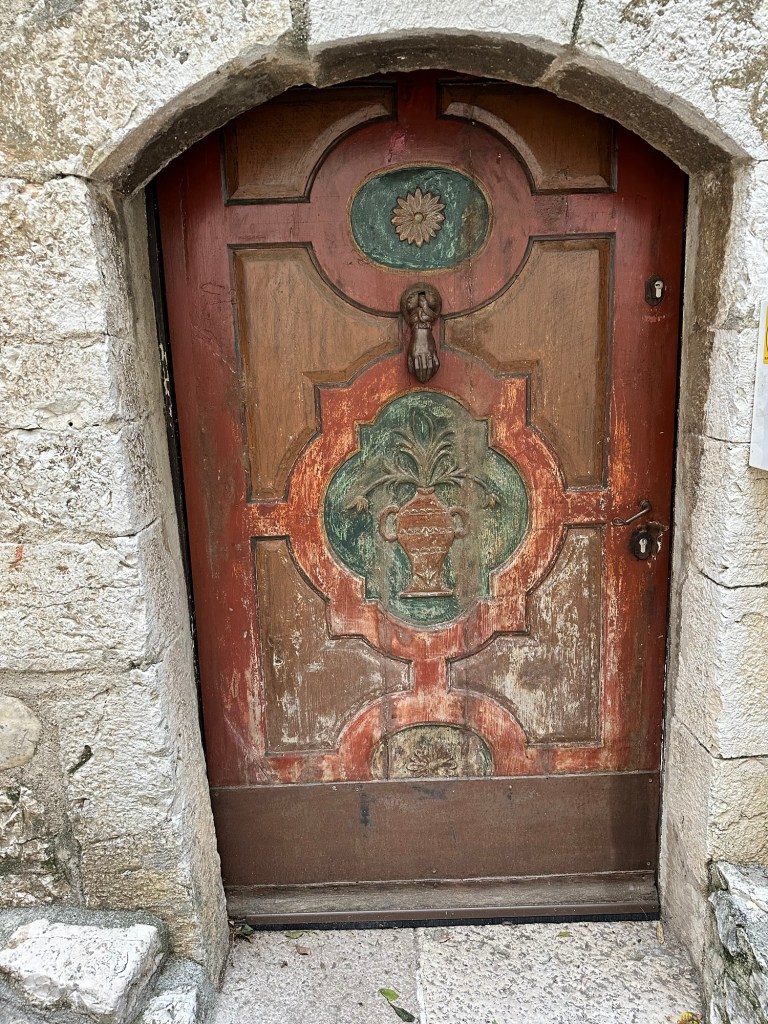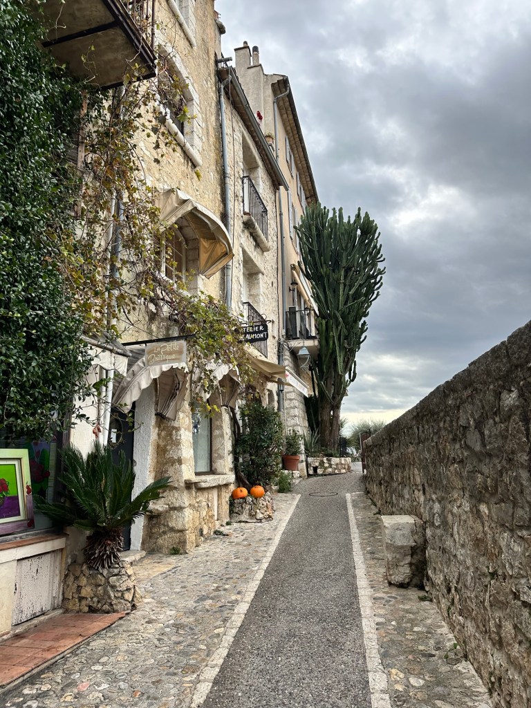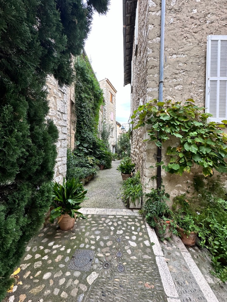 Our final day in the south of France was a short road trip to Provence and the small village of St-Paul-de-Vence and Vence. This is my third time visitng both and I wanted to show Connor and Scott. The area is a well known art community with painters such as Chagall, Matise and Picasso having spent time and influence in the area. The village dates back to the 12th century with intact bastion walls. We walked on top of the perimiter walls with Scott and Connor discussing 13th centry battle strategies – bow and arrow turning to firepower over the centuries. The scenery from the wall showcased the Alps to the north with the Mediteranean to the south. Oh what it must have looked like in the 12th century! We then walked through the village making our way to the top. I loved looking at the local residential front doors, walking only lanes, gardens and verandas. It would be so cool to live in this village, except for the nosey tourists like me. The village hosts a few cafes and pastry shops, art galleries, along with clothing and gift shops. Connor found 2-pieces of grafetti art in different shops in his budget. Cool finds! I bought earings, a velvet jacket and a few Christmas gifts. I also found art, unfortately far outside our budget. The top of the village has a lovely small historic church with a unique black alter that we walked through.