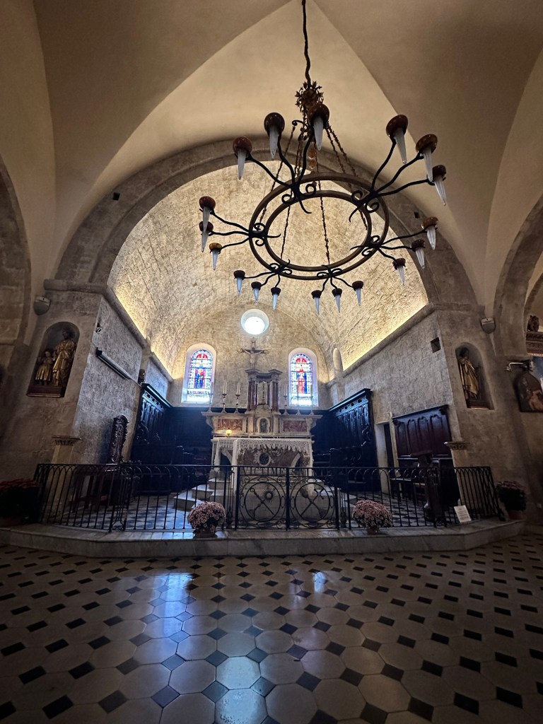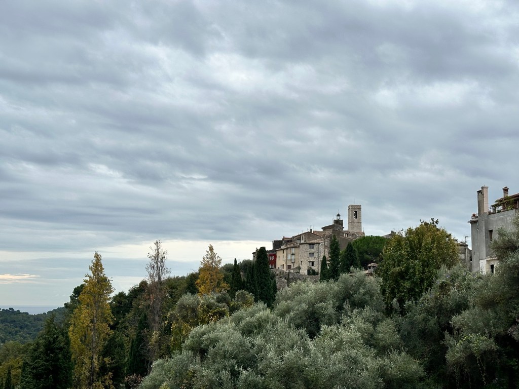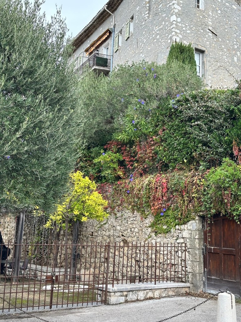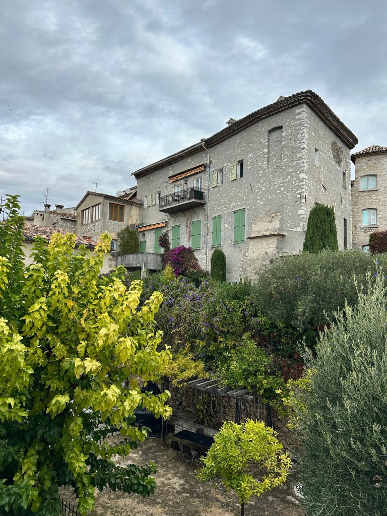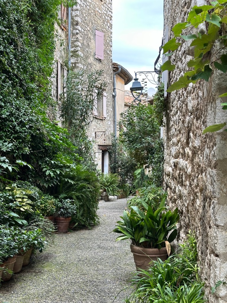 Our final day in the south of France was a short road trip to Provence and the small village of St-Paul-de-Vence and Vence. This is my third time visitng both and I wanted to show Connor and Scott. The area is a well known art community with painters such as Chagall, Matise and Picasso having spent time and influence in the area. The village dates back to the 12th century with intact bastion walls. We walked on top of the perimiter walls with Scott and Connor discussing 13th centry battle strategies – bow and arrow turning to firepower over the centuries. The scenery from the wall showcased the Alps to the north with the Mediteranean to the south. Oh what it must have looked like in the 12th century! We then walked through the village making our way to the top. I loved looking at the local residential front doors, walking only lanes, gardens and verandas. It would be so cool to live in this village, except for the nosey tourists like me. The village hosts a few cafes and pastry shops, art galleries, along with clothing and gift shops. Connor found 2-pieces of grafetti art in different shops in his budget. Cool finds! I bought earings, a velvet jacket and a few Christmas gifts. I also found art, unfortately far outside our budget. The top of the village has a lovely small historic church with a unique black alter that we walked through.