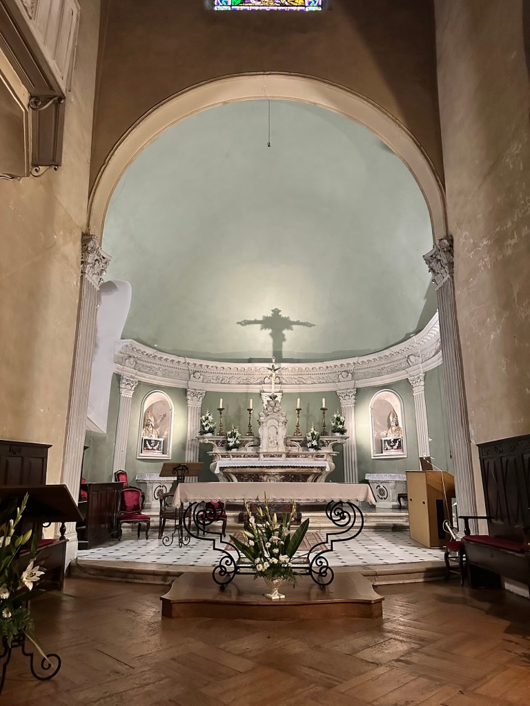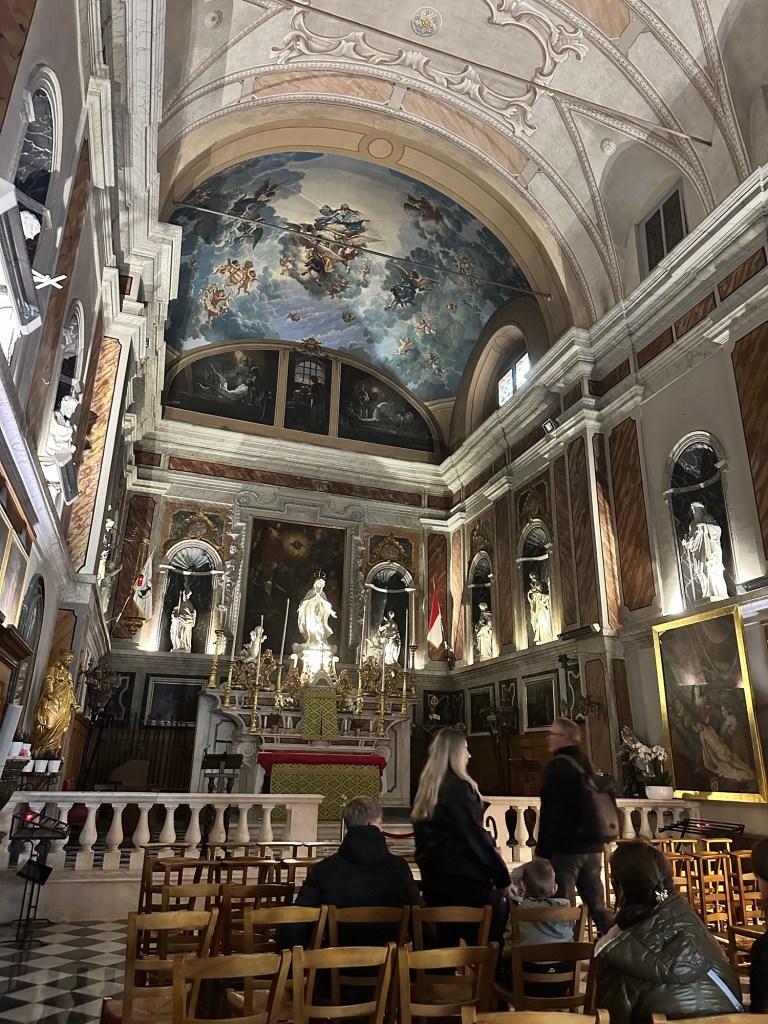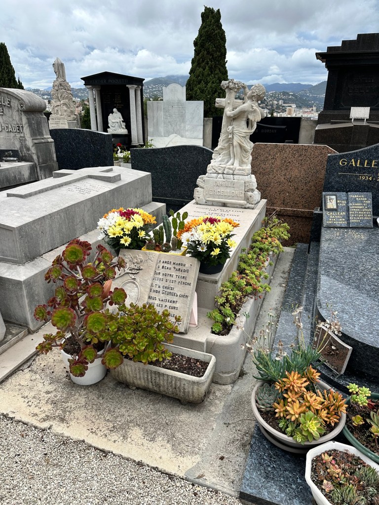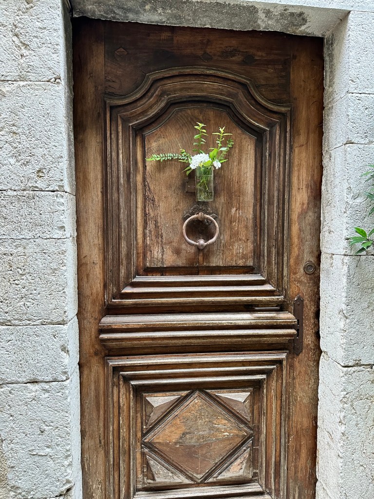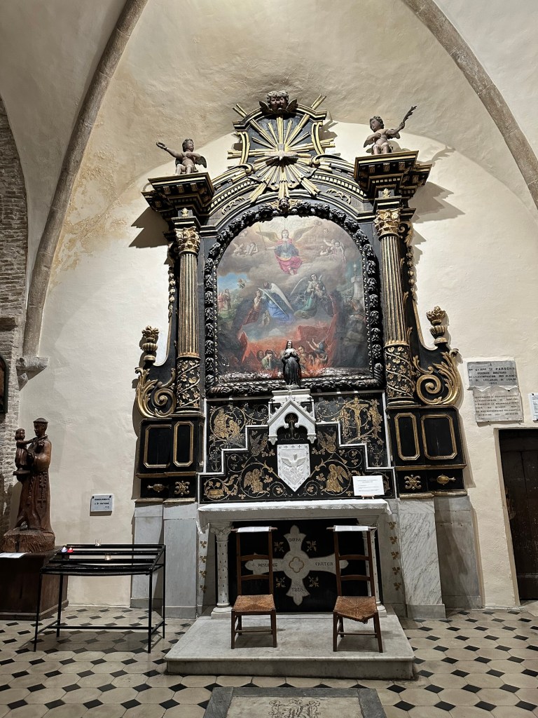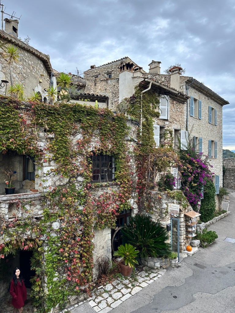 Our final day in the south of France was a short road trip to Provence and the small village of St-Paul-de-Vence and Vence. This is my third time visitng both and I wanted to show Connor and Scott. The area is a well known art community with painters such as Chagall, Matise and Picasso having spent time and influence in the area. The village dates back to the 12th century with intact bastion walls. We walked on top of the perimiter walls with Scott and Connor discussing 13th centry battle strategies – bow and arrow turning to firepower over the centuries. The scenery from the wall showcased the Alps to the north with the Mediteranean to the south. Oh what it must have looked like in the 12th century! We then walked through the village making our way to the top. I loved looking at the local residential front doors, walking only lanes, gardens and verandas. It would be so cool to live in this village, except for the nosey tourists like me. The village hosts a few cafes and pastry shops, art galleries, along with clothing and gift shops. Connor found 2-pieces of grafetti art in different shops in his budget. Cool finds! I bought earings, a velvet jacket and a few Christmas gifts. I also found art, unfortately far outside our budget. The top of the village has a lovely small historic church with a unique black alter that we walked through.