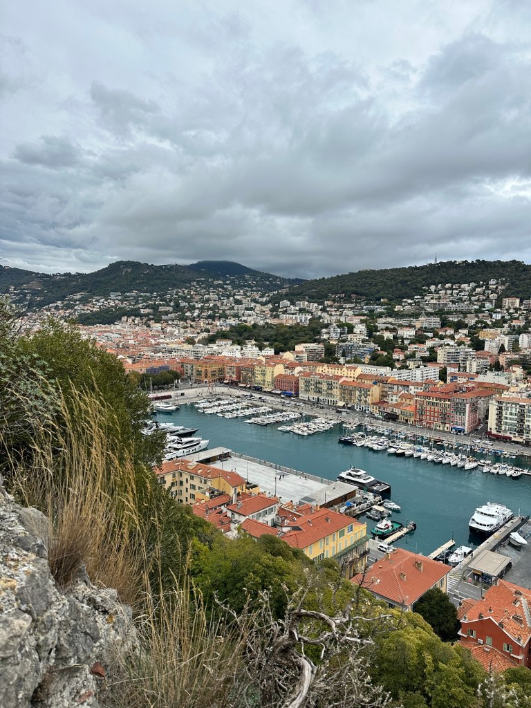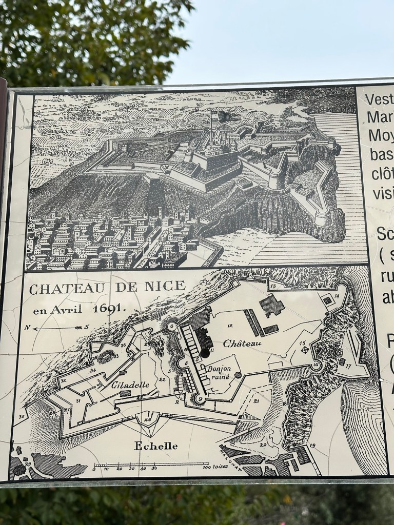 Castle Hill, that we ascended, was the first inhabited area of Nice in the 11th century. At the time, living along the coast was dangerous, too easily overtaken by a military seige. Castle Hill had the advantage of height and a flat top. It was first settled by the Greeks and later taken over by the Romans, as we have found with all of our travels throughout the centuries there was constant upheaval amongst different countries and cultures. During the Middle Ages, the hill developed into a military citadel, known as Château de Nice. Louis XIV ordered the castle to be completely destroyed in 1706 after the War of the Spanish Succession, when the French army sieged the castle. Today it is a very popular public park with views of the bay, the Riviera, and on clear days you can see the snow topped Alps. We walked the entire grounds and headed back to Ville Nice for lunch and shopping.