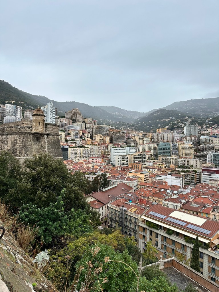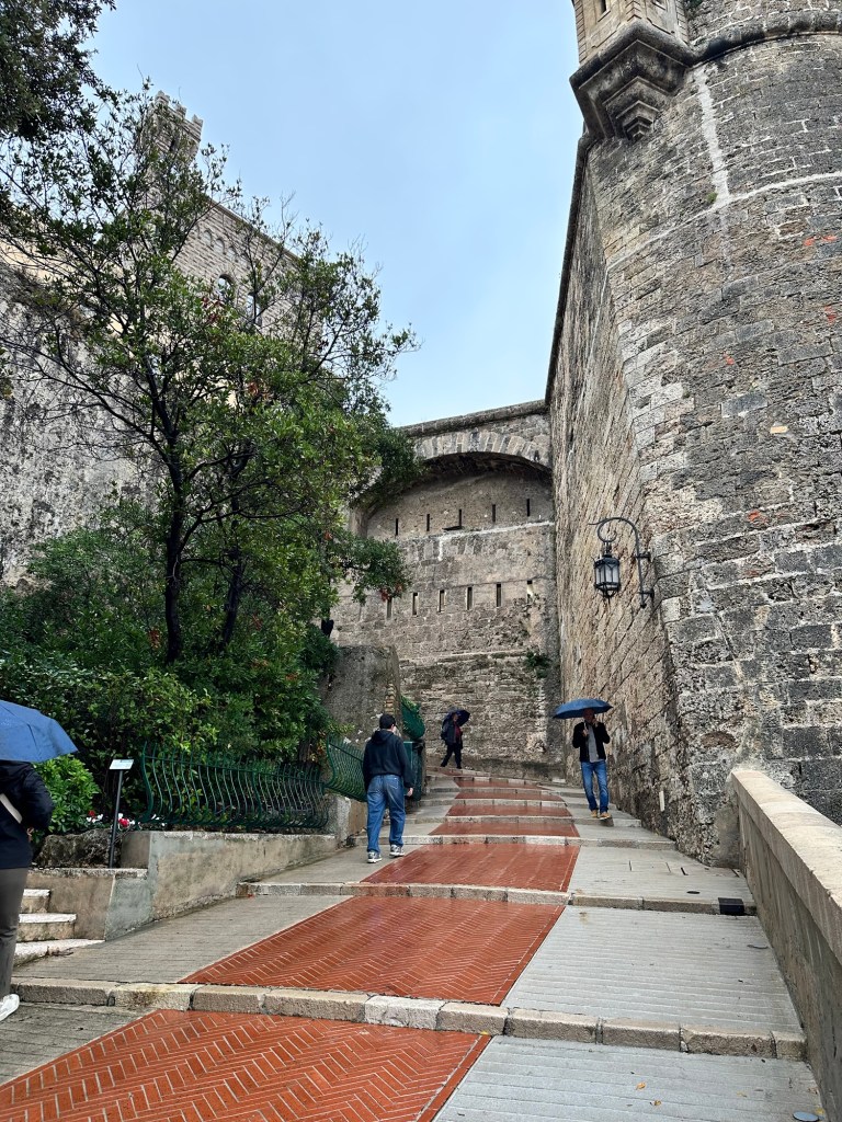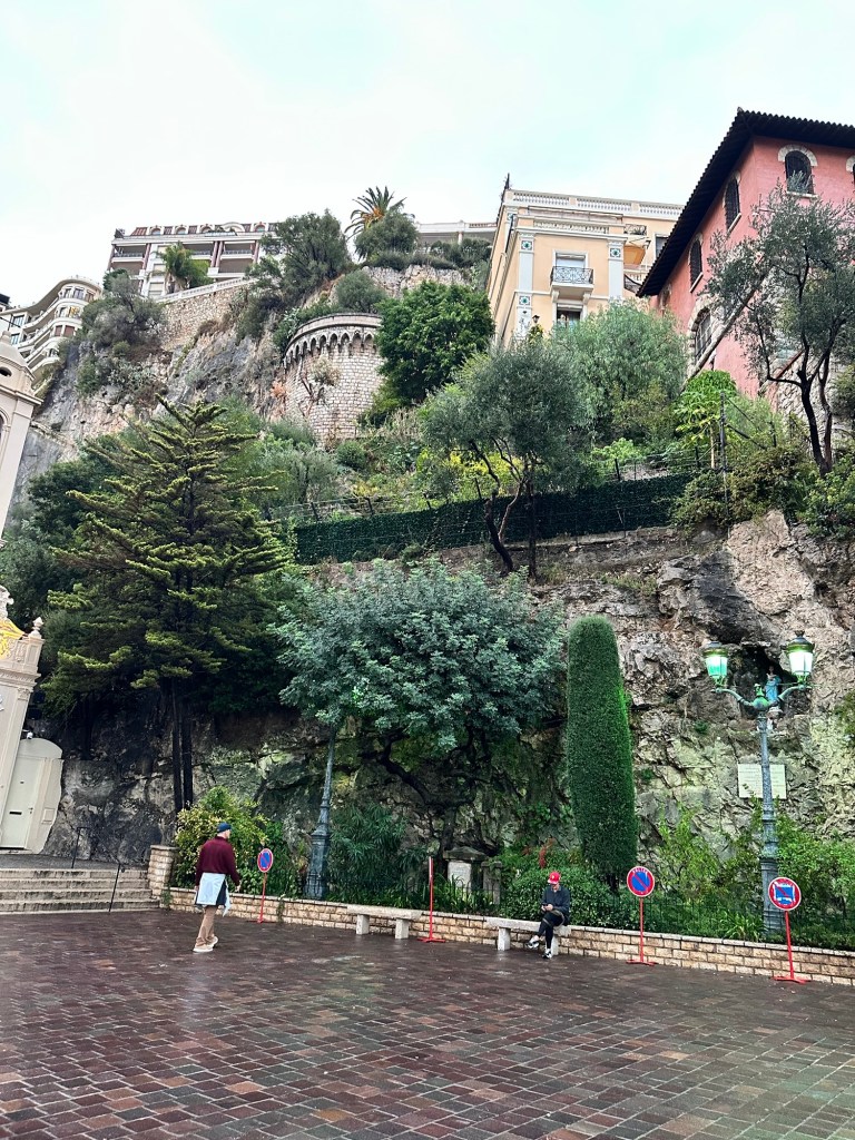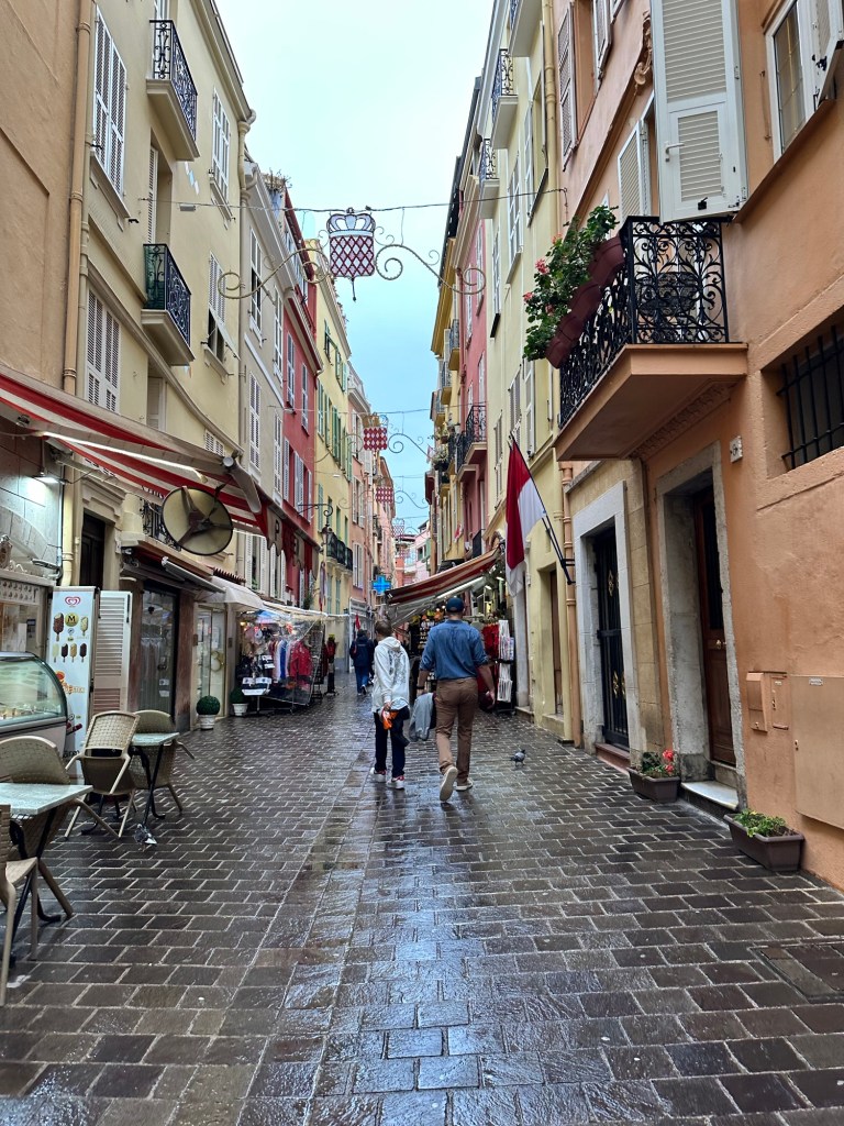 Our second day was rainy and cloudy but did not stop us from getting on the train to Monaco. Monaco was Connor’s request to visit so we could see the small country but mostly so he could see his favorite, race cars! The 20-minute train ride was short but allowed for beautiful views (everything in Monaco is beautiful including the trash cans!) along the coast. We spent the day walking the palace grounds, the beautiful city and taking in an F1 racing tour of the circuit. We enjoyed a nice lunch taking a break from the rain. The F1 tour ended at the the Casino Plaza with especially beautiful and interesting artwork along with high-end shops. We walked through the mall and had a coffee sitting below large scale beautiful chandeliers. Princess Grace, the American actress who married her prince, is referenced throughout the municipality. Everyone speaks French in Monaco, which makes sense as it is run by the French government as a part of the agreement that was cast long ago between France and Monaco. We took the train back to Nice and found a place for dinner before heading back to the hotel. As with the night before, we found a great gelato shop, which we devoured as we walked back through the historic area.