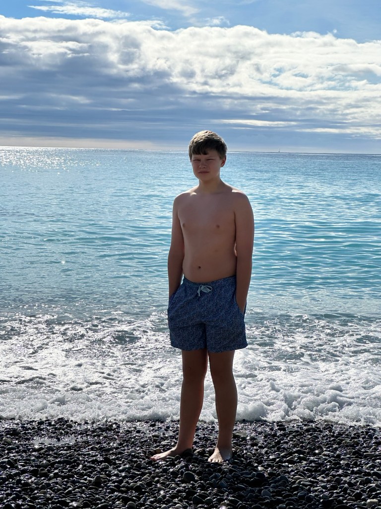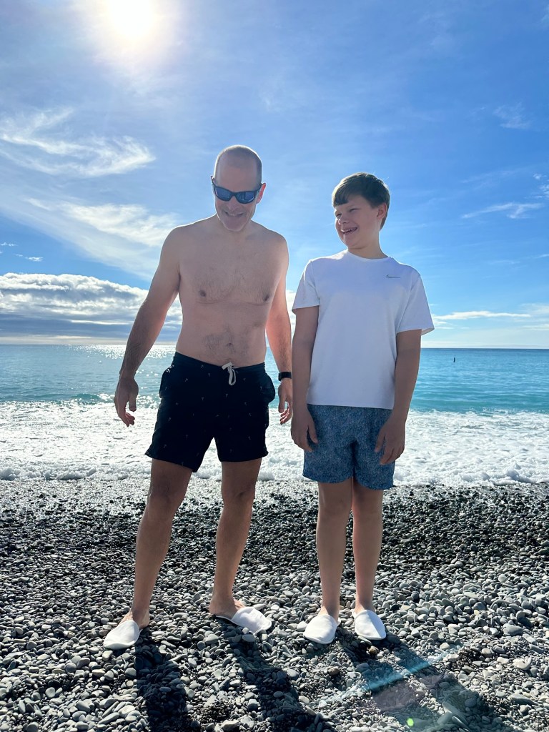 Friday we decided to have a non-scheduled day which seemed like a good idea at the beginning of the day, it was Halloween. We slept in a bit and then went to the “beach“ to swim in the Mediterranean waters. The challenge with the beach is it is all rocks. While it looks beautiful visually, it is not beautiful to walk on. We tried to use slippers from the hotel to walk on the rocky beach and into the water (also has the rocks), which was quite funny. We still enjoyed time at the beach with the unique blue waters, the landscape views and people watching (always fascinating). As you can imagine the water was chilly so we warmed up in the rooftop heated pool overlooking the Mediterranean. Our party then broke up, I went shopping searching for lunch on the go, and the boys got lunch at the rooftop bar ($38 hamburger, yikes) and car spotting on the Promadade de Anglais from the rooftop. I found lots of fun shops and ate a yummy quiche on walk about. We regrouped to walk through the tourist area which included a few art shops where Connor picked up the art bug. He found several grafitti art options, out of his price range and too early for Christmas. But this interest carried over into the next day. We ended the day at an Itallian restaurant in Ville Nice with a large pedestrian promenade sitting outside. Throughout the afternoon we began to see costumes and locals in makeup, all ages. More goolish and goblin types than cute, sweet or funny, even the young kids. Definately a different vibe. The challenge for sweet Connor was he missed his buddies!!! It hit him hard knowing he was not with the boy pack roaming our neighborhood at home. We all missed our normal Halloween, but we talked, ate and watched the French Halloween. Instead of “Trick or Treat” the kids walked into restaurants and shops with their bags saying “Bonjour” or “Bonne soire’e”. The littles sounded very cute. We ended with gelato cookie sandwiches, yum.