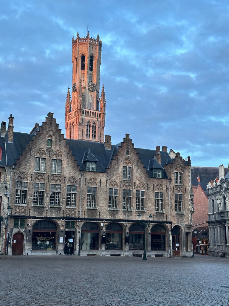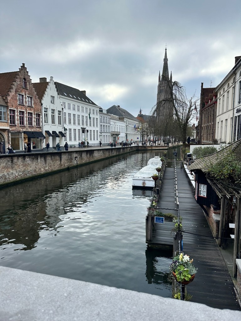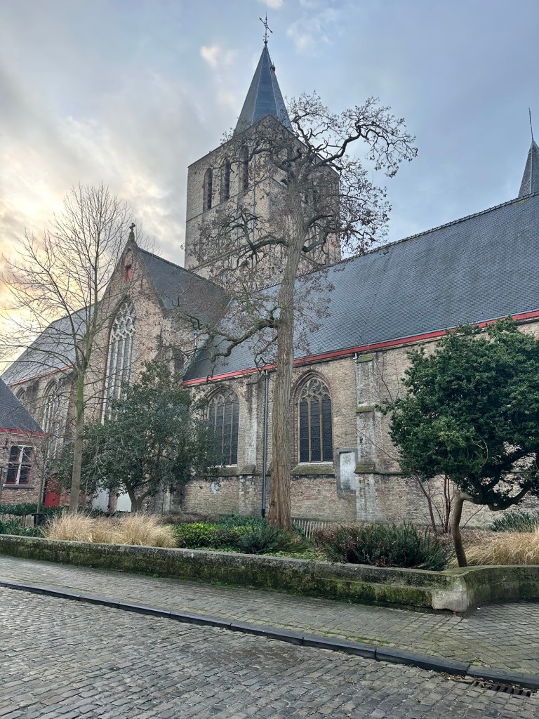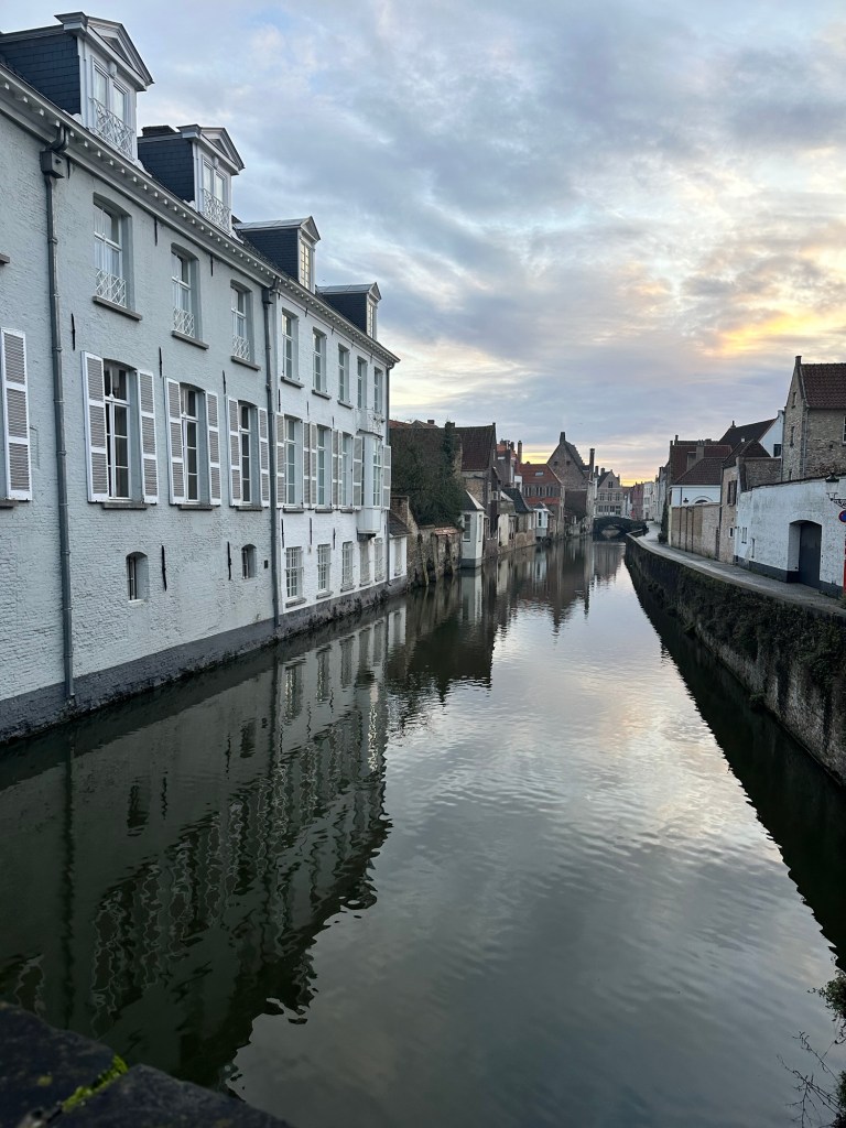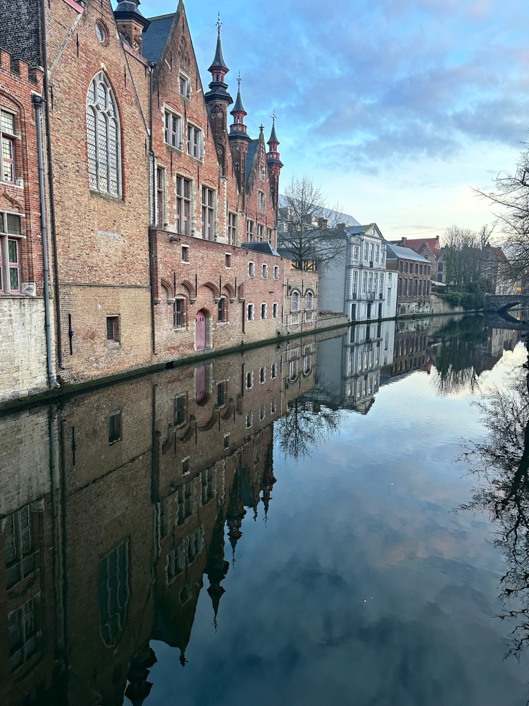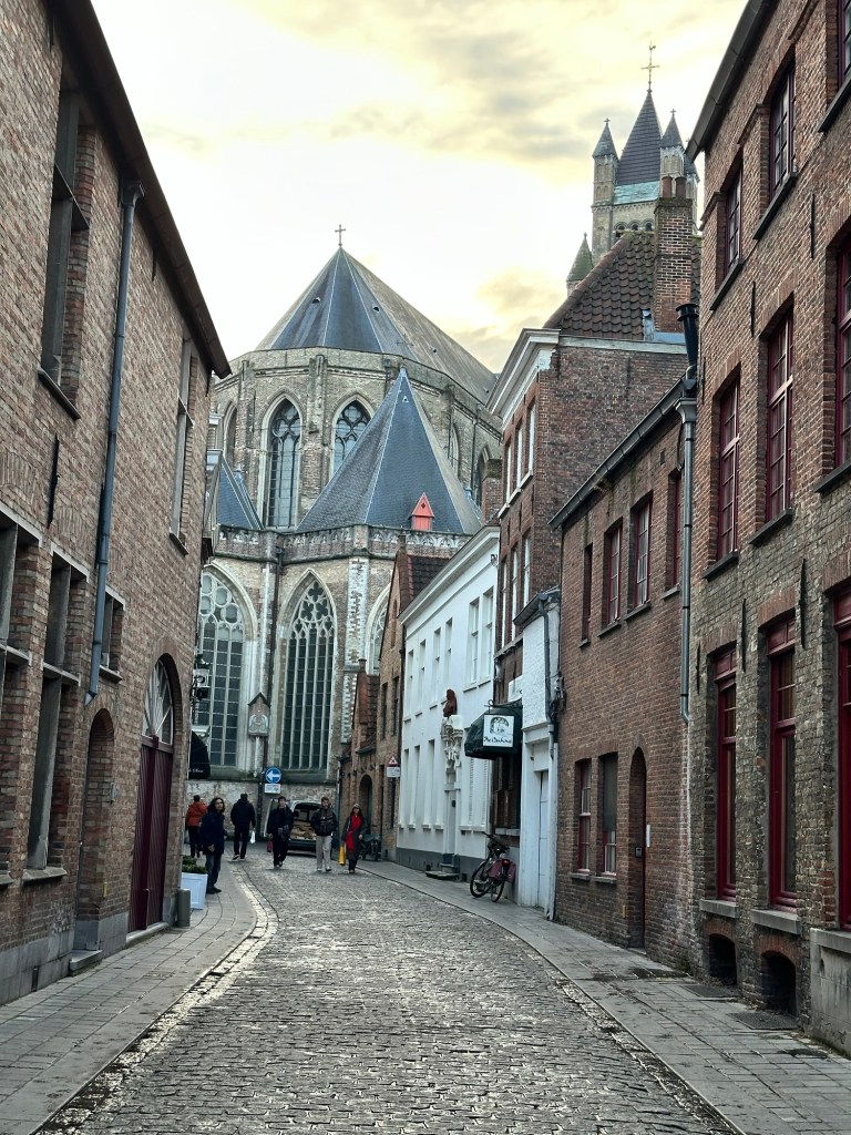 We visited The Church of our Lady, which dates to the 13th century. Many interesting points to note about this church, first it is the tallest structure in Bruges and the 3rd tallest brick-work church tower in the world! The art this church houses is historic and beautiful. Of note is a Madonna and child white marble sculpture by Michelangelo. But what I found the most stunning was the room size bronze depiction of the Life of Christ, the Passion Triptych, from the 16th-century. The artwork depicts the life and passion of Christ, including the Crucifixion, Flagellation, and Descent into Limbo. The artistās portrayal is very unique, raw and stark against the white chancel backdrop. Sunday morning I was up early with Bucky and went for a long walk through the historic village. We were one of just a few other walkers enjoying the quiet solitude and beauty of the streets and canals as the church bells rang.