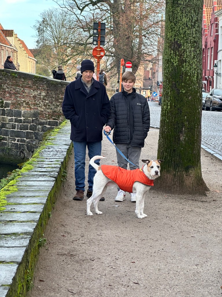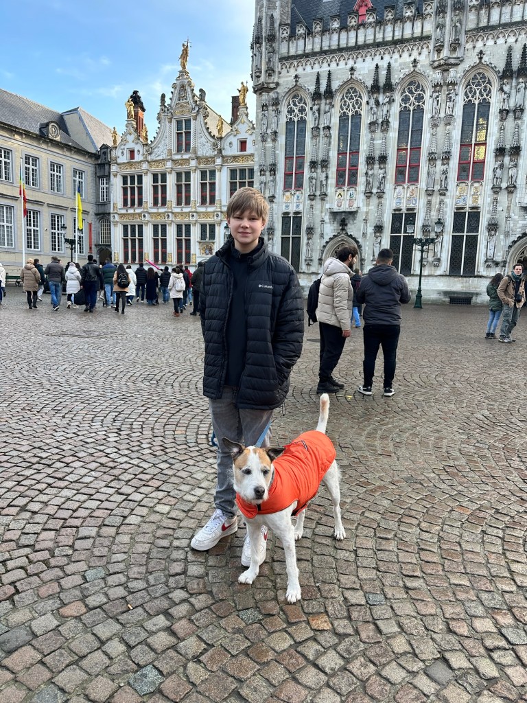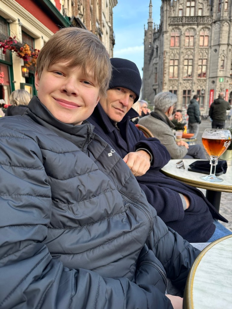 Alright, those are the lows. Sorry you had to read all that and feel the emotions with me. Now on to the highs! After the accident we needed a break from the city, cars and trafficā¦.we decided on Bruges. A short 70 minute drive from Brussels, Scott drove us while I tried to remain calm. Deep breaths and prayers. We spent the night in this picturesque village, no cars was a very nice break. We walked and walked, and just breathed. Bucky came with us and had a nice trip. He had lunch with us and when we left the restaurant other guests commented on how calm he was. Finally an 8-year old with maturity. We climbed the bell tower, we visited churches, we bought cheap sunglasses and we tasted amazingly rich chocolate.